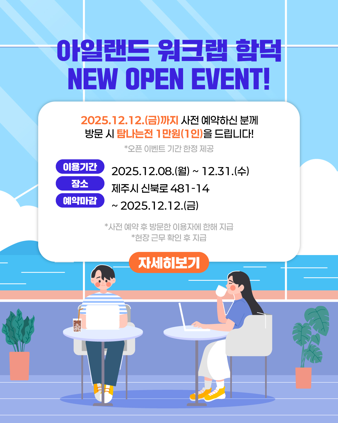 제주의 자연 속에서 일과 휴식 모두를 누릴 수 있는 새로운 근무 문화, 제주워케이션과 함께하세요.